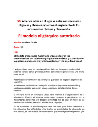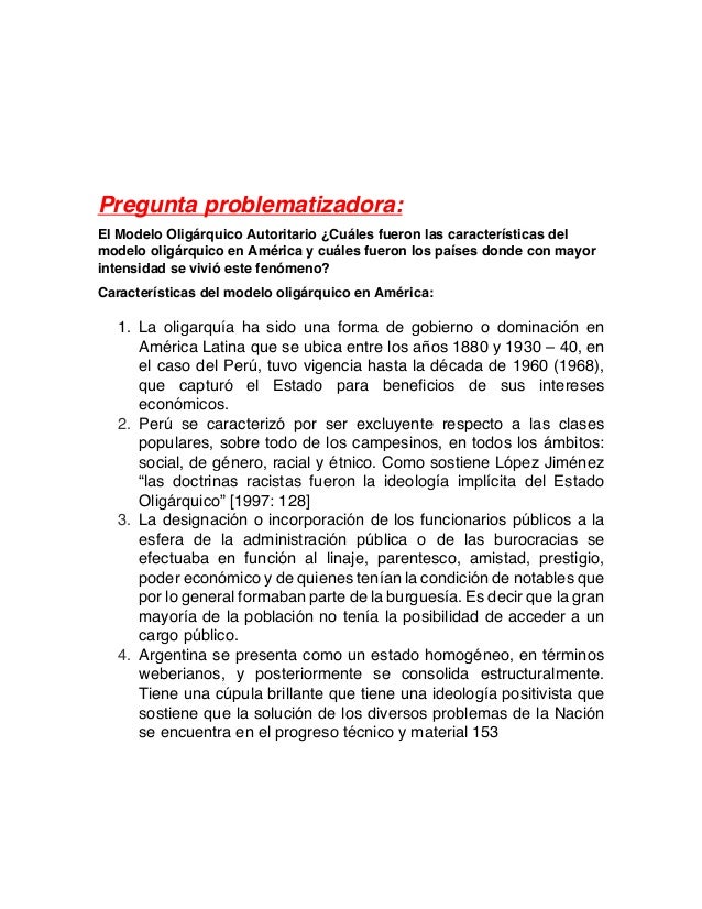 Este pequeño grupo se caracteriza porque tiende a controlar las políticas sociales y económicas del Estado a favor sobre todo de sus. 1 Uno de los rasgos que caracteriza a la organización del Estado en Latinoamérica es que lleva a la oligarquía como hilo conductor. Los escritores políticos de la antigua Grecia emplearon el término para designar la forma degenerada y negativa de aristocracia literalmente gobierno de los mejores. Su poder fluye a través de sus relaciones entre sí. El problema es que la oligarquía quiere entrar en los espacios donde hay recursos como ríos o mineras y éstos son los mismos espacios donde están los pueblos originarios. No funciona en ámbitos más amplios en los que hay diferencias y conflictos de intereses y valores cuya resolución requiere competencia técnica un cierto distanciamiento emotivo de los.