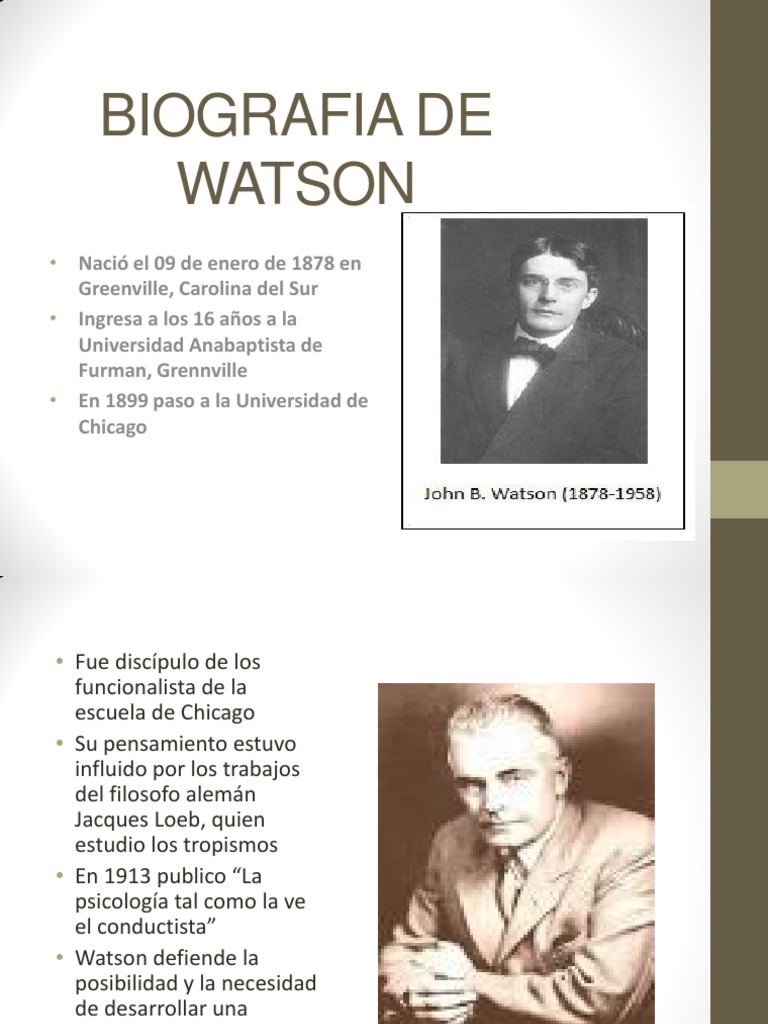 Watson intentó hacer una Psicología objetiva a través del. JOHN BROADUS WATSON Biografia. Watson creía que la psicología debería ser principalmente un comportamiento científico observable. About Press Copyright Contact us Creators Advertise Developers Terms Privacy Policy Safety How YouTube works Test new features Press Copyright Contact us Creators. Biografía de John Broadus Watson John Broadus Watson nació en Greenville Carolina del Sur Estados Unidos en 1878 y falleció en Nueva York en 1958. Watson 1878-1958 fue un psicólogo estadounidense fundador del Behaviorismo o Conductismo.